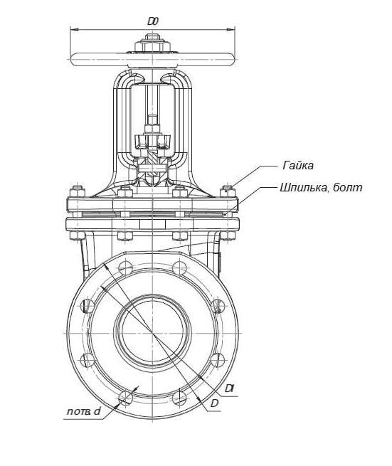 Чертеж задвижки 30с64нж Ру 25. Вид спереди. |